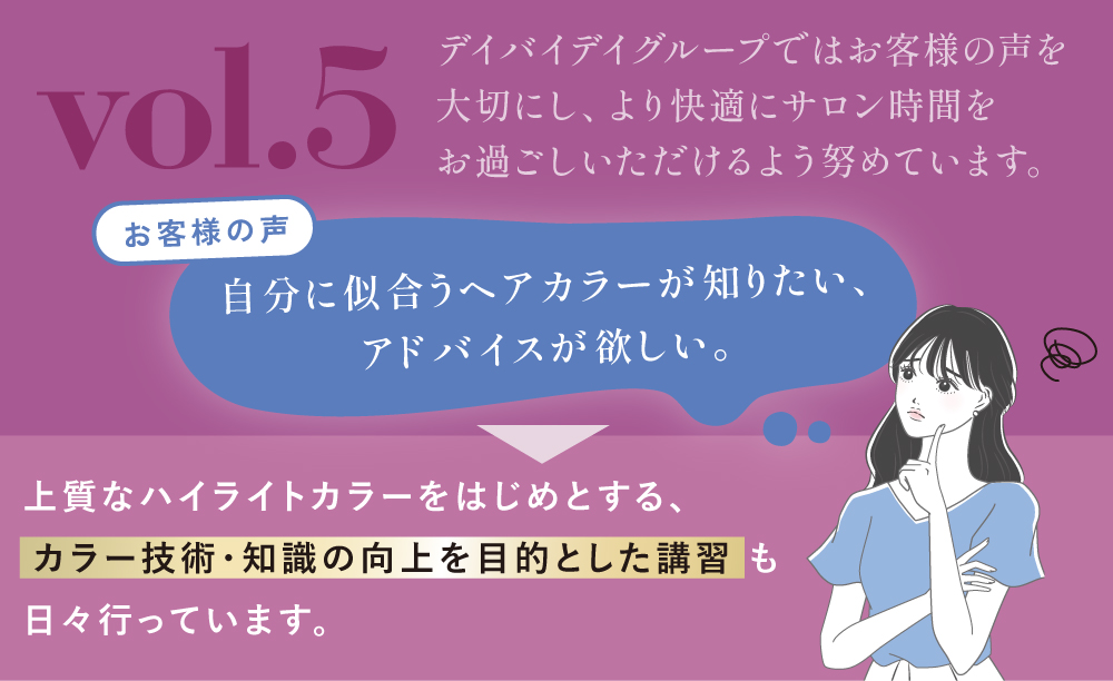 デイバイデイグループではお客様の声を大切にし、より快適にサロン時間をお過ごしいただけるよう努めています。