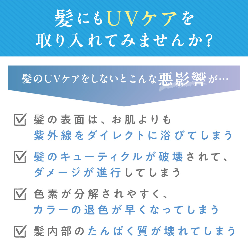 髪のUVケアでダメージやカラーの退色、乾燥を防ぎ、ツヤと潤いのある美しい髪をキープしましょう。 紫外線は一年中降り注いでいるので、日常的なケアもオススメです。