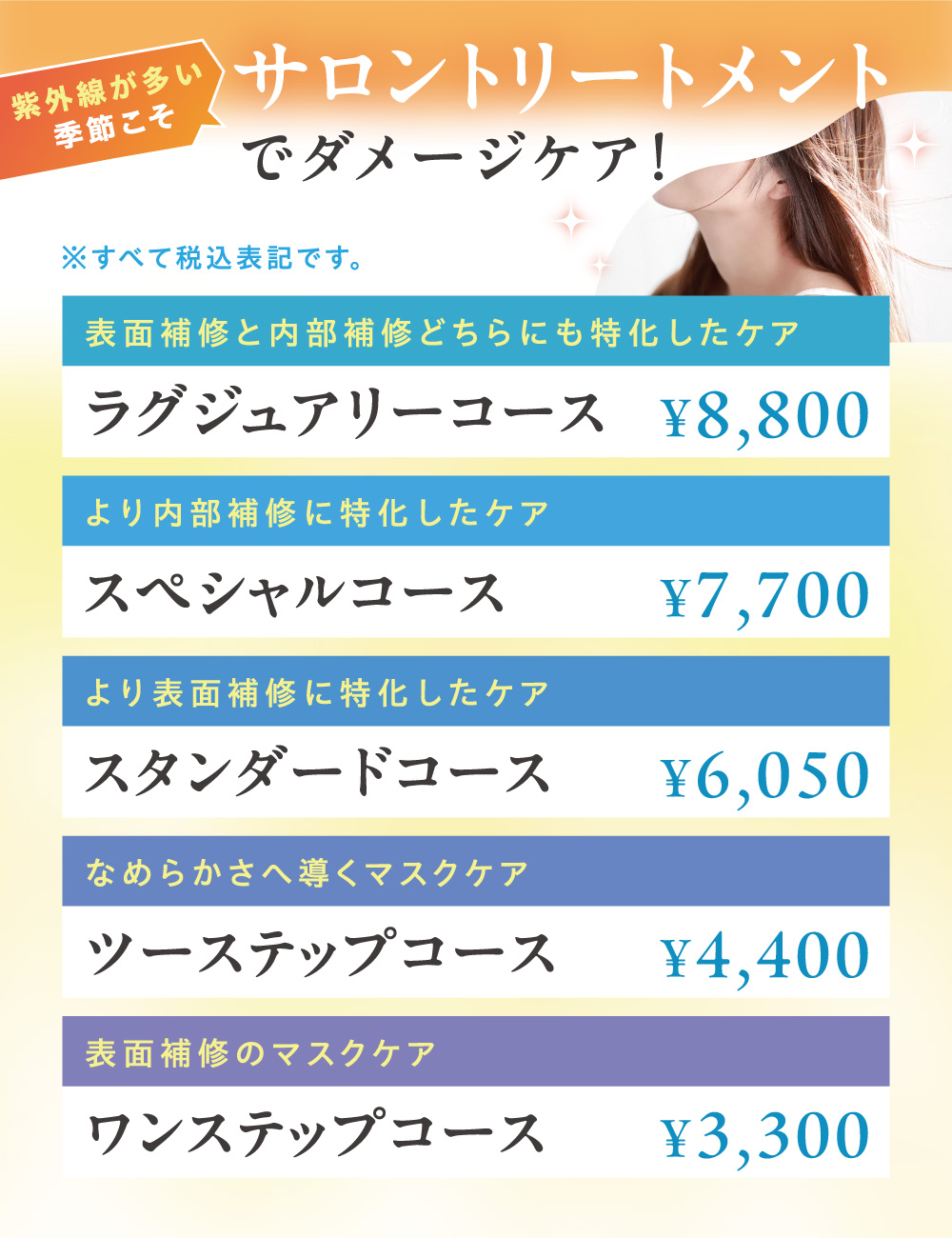 紫外線によるダメージでパサついてしまった髪も、サロントリートメントでなめらかな手触りに。選べる5つのコースをご紹介します。