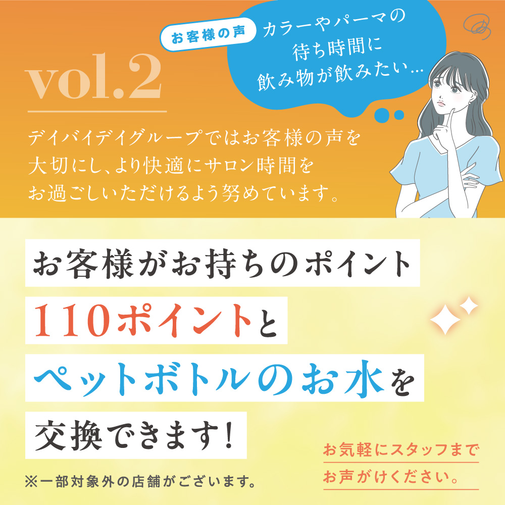 デイバイデイグループではお客様の声を大切にし、 より快適にサロン時間をお過ごしいただけるよう努めています。今回はポイント活例についてお伝えします。