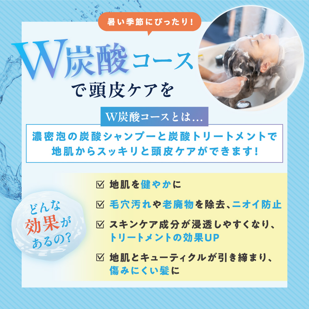 暑い季節にぴったりな頭皮ケアメニュー「W炭酸コース」をご紹介します。