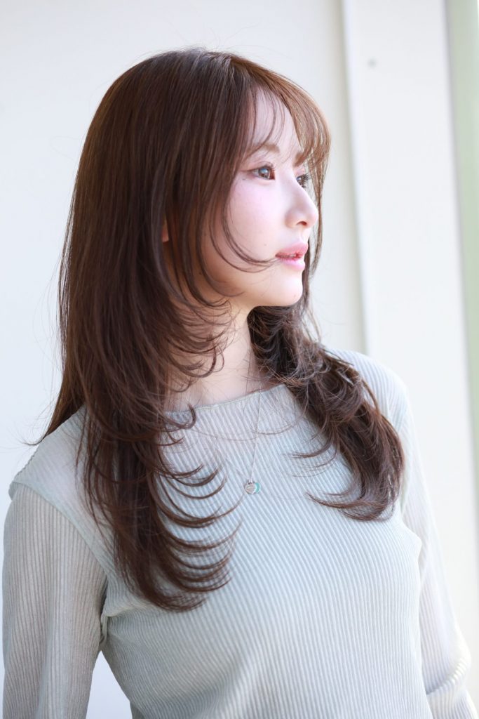 | スタイルのポイント | しっかりと入ったざっくりレイヤーと顔周りのレイヤーがトレンド感のあるロングスタイルです。ワンカールで動きが出て巻き髪もつくりやすいので、韓国風アレンジなどが可愛く仕上がります。 |